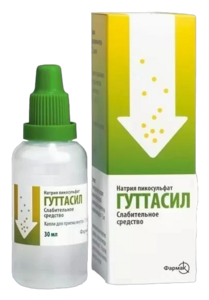Показания к применениюЗапоры или случаи, требующие облегчения дефекации (геморрой, проктит, трещины заднего прохода, подготовка к хирургическим вмешательствам, инструментальным и рентгенологическим исследованиям).Противопоказания Повышенная чувствительность к натрия пикосульфату и другим компонентам препарата; кишечная непроходимость; острые воспалительные заболевания кишечника и острые заболевания органов брюшной полости (в т.ч. острый аппендицит, неспецифический язвенный колит, перитонит); острая абдоминальная боль, сопровождающаяся тошнотой и рвотой, которая может указывать на острые воспалительные заболевания, тяжелая дегидратация; беременность (I триместр); период лактации.С осторожностью: пациенты пожилого возраста, гипокалиемия, повышенное содержание магния в крови, пациенты с астенией, II–III триместры беременности.Побочное действиеСо стороны кожи: кожная сыпь, крапивница, зуд.Со стороны водно-электролитного баланса: потеря калия, натрия и других электролитов, возможно развитие дегидратации.Со стороны пищеварительной системы: диспептические явления, рвота, тошнота, спазмы и боль в животе, диарея, метеоризм, болевые ощущения в области желудка и области ануса, усиление моторики кишечника, которые проходят при уменьшении дозы препарата.Со стороны иммунной системы: аллергические реакции, ангионевротический отек.Со стороны ЦНС: головная боль, повышенная утомляемость, сонливость, судороги.Состав вода, сорбит (подсластитель), хлорид калия, лактат магния, витамин С (аскорбиновая кислота), пикосульфат натрия (7,5 мг/мл), лимонная кислота (регулятор кислотности), цитрат натрия (регулятор кислотности), бензоат натрия (консервант)Взаимодействие с другими препаратамиЭлектролитный дисбаланс может привести к снижению толерантности к сердечным гликозидам.Диуретики или ГКС могут усиливать выраженность гипокалиемии, вызванной применением Гуттасила в высоких дозах.Одновременное лечение антибиотиками может снизить слабительный эффект препарата.