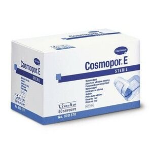 Повязка пластырного типа Cosmopor Е steril/ Космопор Е стерил – это стерильная самоклеящаяся повязка пластырного типа, изготовленная из мягкого нетканого перфорированного воздухопроницаемого материала с закругленными краями, покрытая не раздражающим кожу гипоаллергенным синтетическим каучуковым клеем, имеющая впитывающую подушечку, покрытую сеткой, предотвращающей прилипание подушечки к ране и обеспечивающую хорошую абсорбцию. Адгезивная (клеящая) сторона повязки покрыта белым силиконовым пергамином, который необходимо удалить перед наложением повязку на рану. Повязка не содержит латекса.