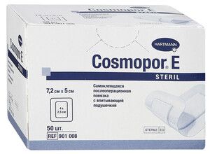 Бренд ПАУЛЬ ХАРТМАНН (PAUL HARTMANN) — ведущий европейский разработчик и поставщик продукции медицинского назначения в таких областях, как первая помощь, уход за ранами, профилактика внутрибольничной инфекции, уход за больными на дому, гигиена и дезинфекция, домашняя диагностика.ПОВЯЗКИ ПЛАСТЫРНОГО ТИПА СТЕРИЛЬНЫЕ COSMOPOR E STERIL/КОСМОПОР Е СТЕРИЛ — стерильная самоклеящаяся повязка на рану из мягкого нетканого материала со специальной не приклеивающейся к ране впитывающей подушечкой. Обладает хорошей сорбционной способностью и защитными свойствами, благоприятна для кожи за счет гипоаллергенных свойств синтетического клея.Впитывает и защищает: Впитывающая подушечка обладает хорошей сорбционной способностью и защитными свойствами Не присыхает к ране, смена повязки происходит безболезненно СтерильнаяХорошо держится и благоприятна для кожи: Мягкий нетканый материал пропускает воздух Не раздражает кожу, удаляется легко и без остатков Надежно держится и не отклеивается.Повязка на рану Космопор Е представлена в широком ассортименте для ран любого размера.Современная повязка на рану стала гораздо удобнее: впитывающая подушечка заменяет марлевый/ватный слой повязки, а нетканый материал на самоклеящейся основе — несколько слоев бинта.Размер впитывающей подушечки 4 х 2,5 см, размер всей повязки с клеящим краем — 7,2 х 5 см. При подборе размера повязки обращайте внимание, что размер впитывающей подушечки должен быть больше размера раны.