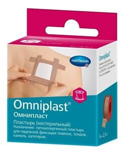На пластмассовых катушках. Особо прочный пластырь из текстильной ткани с клеем на основе синтетического каучука. Пластырь обладает сильной клеящей способностью. Воздухо- и паропроницаемый, телесного цвета, имеет водоотталкивающую пропитку. Легко рвется в поперечном направлении благодаря зигзагообразной кромке.Особенности: Фиксирующий пластырь Омнипласт из текстильной ткани с синтетическим каучуковым клеем, пропитан оксидом цинка Обладает сильной клеящей способностью, особо прочный, имеет водоотталкивающую пропитку Нейтрален к рентгеновским лучам, устойчив к температурным воздействиям Цвет кожи Размер 2.5 см х 5 м, На пластмассовой катушке с защитным кольцом Гипоаллергенный. Не вызывает мацерацию кожи. Надежно держится