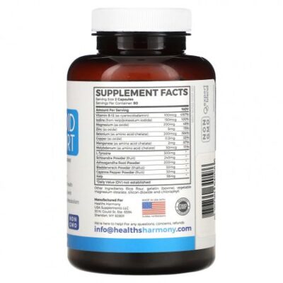 Описание С йодомБез ГМОПищевая добавкаЭкспертная смесьПроизводится на предприятии, имеющем регистрацию надлежащей текущей производственной практики GMPПоддерживаетЗдоровье щитовидной железыНормальный уровень энергииПоддерживает здоровый метаболизмПревосходная формула для здоровья щитовидной железыСредство для поддержки щитовидной железы Health Harmony специально разработано с использованием ключевых ингредиентов для поддержания здоровья щитовидной железы.Наша смесь включает в себя минералы цинк, медь, магний, марганец и селен, а также травы лимонника и мочевого пузыря, которые, как известно, способствуют выработке гормонов щитовидной железы. Порошок кайенского перца улучшает усвоение и доставляет эти питательные вещества во все части вашего тела. Рекомендации по применению Принимать по 2 капсулы в день во время еды или в соответствии с рекомендациями врача. Ингредиенты Рисовая мука, желатин (бычий), растительный стеарат магния, диоксид кремния и хлорофилл. Этот продукт производится и упаковывается на предприятии, где также может перерабатываться молоко, сои, пшеница, яйца, арахиса, древесные орехи, моллюски и ракообразные.