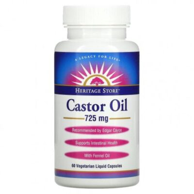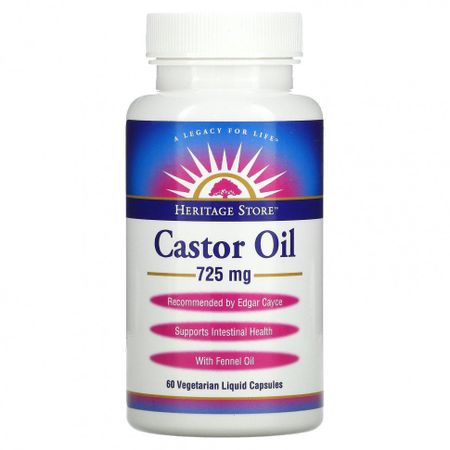 * Суточная доза не определена Legacy for Life™Рекомендовано Эдгаром КейсиПоддержка здоровья органов пищеваренияСодержит масло фенхеляЭтичный и экологичный продуктОписание Касторовое масло получают из бобов клещевины (Ricinus communis), которые содержат уникальную рицинолевую кислоту, известную своими полезными для здоровья свойствами. Касторовое масло издавна используется для улучшения и поддержания здоровья органов пищеварения и общего самочувствия. При использовании в сочетании с диетой, подразумевающий употребление клетчатки, компрессами с касторовым маслом и большим количеством воды вегетарианские капсулы с жидкостью с касторовым маслом способствуют эффективному очищению кишечника.
