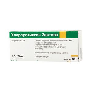 Показания к применениюХлорпротиксен является седативным нейролептиком с широким спектром показаний, в которые входят:психозы, включая шизофрению и маниакальные состояния, протекающие с психомоторным возбуждением, ажитацией и тревогой;похмельный абстинентный синдром при алкоголизме и наркоманиях;гиперактивность, раздражительность, возбуждение, спутанность сознания у пожилых пациентов;нарушения поведения у детей;депрессивные состояния, неврозы, психосоматические расстройства;бессонница;боли (в комбинации с анальгетиками).Применение при беременности и кормлении грудьюПротивопоказан к применению при беременности и в период лактации.Противопоказанияугнетение ЦНС любого происхождения (в том числе вызванное, приемом алкоголя, барбитуратов или опиатов);коматозные состояния;сосудистый коллапс;заболевания органов кроветворения;феохромоцитома;повышенная чувствительность к компонентам Хлорпротиксена.Побочное действиеСонливость, тахикардия, сухость во рту, повышенная потливость, трудность аккомодации. Эти побочные эффекты, обычно возникающие в начале терапии, часто исчезают по мере ее продолжения.Может наблюдаться ортостатическая гипотензия, особенно при применении Хлорпротиксена в высоких дозировках.Головокружение, дисменорея, кожные высыпания, запоры встречаются редко. Экстрапирамидные симптомы особенно редки.Описаны единичные случаи снижения судорожного порога, возникновения транзиторной доброкачественной лейкопении и гемолитической анемии.При длительном применении, особенно в высоких дозах, могут наблюдаться: холестатическая желтуха, галакторея, гинекомастия, снижение потенции и/или либидо, повышение аппетита, увеличение массы тела.СоставДействующее вещество: Хлорпротиксен (Chlorprothixenum)Концентрация действующего вещества (мг): 15