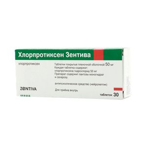 Показания к применениюХлорпротиксен является седативным нейролептиком с широким спектром показаний, в которые входят:психозы, включая шизофрению и маниакальные состояния, протекающие с психомоторным возбуждением, ажитацией и тревогой;похмельный абстинентный синдром при алкоголизме и наркоманиях;гиперактивность, раздражительность, возбуждение, спутанность сознания у пожилых пациентов;нарушения поведения у детей;депрессивные состояния, неврозы, психосоматические расстройства;бессонница;боли (в комбинации с анальгетиками).Применение при беременности и кормлении грудьюПротивопоказан к применению при беременности и в период лактации.Противопоказанияповышенная чувствительность к компонентам Хлорпротиксена;угнетение ЦНС любого происхождения (в том числе вызванное, приемом алкоголя, барбитуратов или опиатов);коматозные состояния;сосудистый коллапс;заболевания органов кроветворения;феохромоцитома.Побочное действиеСонливость, тахикардия, сухость во рту, повышенная потливость, трудность аккомодации. Эти побочные эффекты, обычно возникающие в начале терапии, часто исчезают по мере ее продолжения.Может наблюдаться ортостатическая гипотензия, особенно при применении Хлорпротиксена в высоких дозировках.Головокружение, дисменорея, кожные высыпания, запоры встречаются редко. Экстрапирамидные симптомы особенно редки.Описаны единичные случаи снижения судорожного порога, возникновения транзиторной доброкачественной лейкопении и гемолитической анемии.При длительном применении, особенно в высоких дозах, могут наблюдаться: холестатическая желтуха, галакторея, гинекомастия, снижение потенции и/или либидо, повышение аппетита, увеличение массы тела.Состав1 таблетка содержит:Активное вещество: хлорпротиксена гидрохлорид 50 мг.Вспомогательные вещества: крахмал кукурузный — 37.5 мг, лактозы моногидрат — 135 мг, сахароза — 20 мг, кальция стеарат — 3.75 мг, тальк — 3.75 мг.Состав пленочной оболочки: гипромеллоза 2910/5 — 3.6594 мг, макрогол 6000 — 0.1333 мг, макрогол 300 — 0.9166 мг, тальк — 2.4194 мг, титана диоксид — 0.3423 мг, краситель железа оксид желтый — 0.029 мг.