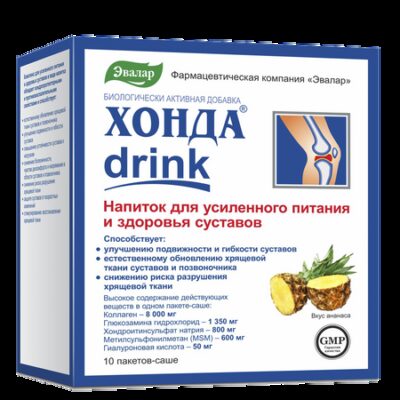 Хонда drink обладает хондропротекторными, противовоспалительными свойствами и способствует:Естественному обновлению хрящевой ткани суставов и позвоночника Снижению болезненности, чувства дискомфорта и напряжения в области суставов и позвоночника Повышению устойчивости суставов к нагрузкам Снижению риска разрушения хрящевой ткани Улучшению подвижности и гибкости суставов Защите суставов от возрастных изменений Стимулированию восстановления хрящевой ткани.