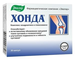 Хонда. Комплекс хондроитина и глюкозамина для естественного обновления хрящевой ткани суставов и позвоночника, улучшения подвижности и гибкости суставов.Активное вещество: глюкозамин, хондроитин, кора ивы, экстракт лопухаДействие: для естественного обновления хрящевой ткани суставов и позвоночника, улучшения подвижности и гибкости суставовКогда суставы здоровы, мы движемся по жизни легко и непринужденно. Но любая система рано или поздно дает сбой. Стоит суставам «заржаветь», как мы оказываемся на обочине жизни. Вам нужны «ржавые» суставы?! Конечно, нет!Чтобы суставы не «ржавели», принимайте хондроитин-глюкозаминовый комплекс Хонда! Усиливая действие друг друга, глюкозамин и хондроитин предотвращают процессы разрушения и стимулируют естественное обновление хрящевой ткани суставов, улучшают функциональное состояние опорно-двигательного аппарата*. Недаром в мировой практике хондроитин-глюкозаминовые комплексы – №1 для естественного сохранения хрящевой ткани суставов и позвоночника!Кроме того, в ассортименте компании «Эвалар» есть БАД Хонда Форте с максимальной суточной дозировкой хондроитина – 500 мг и глюкозамина – 500 мг в одной таблетке, как в зарубежных аналогах.Дополнительно применяйте крем Хонда для области суставов и позвоночника. Крем Хонда так же, как капсулы и таблетки, содержит активный хондроитин-глюкозаминовый комплекс и дополнительно усилен экстрактами трав и натуральными эфирными маслами.