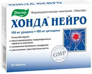 Очень часто проблемы с суставами и позвоночником могут осложняться проявлениями невропатического характера: онемение, жжение, покалывание, внезапные “прострелы” в конечностях и суставах — всё это может быть следствием повреждения волокон периферических нервов.Именно такие симптомы могут быть предвестниками невропатии.Причинами ее развития могут быть:длительное нарушение обмена веществ (например, при ожирении, диабете),сдавливание и защемление нервов, в том числе после травм,малоподвижный образ жизни,воспалительные процессы в организме.В Европе для лечения невропатии широко используют лекарства, содержащие цитидин и уридин – это витаминоподобные вещества, которые успешно осуществляют восстановление (регенерацию) клеток нервной системы. Цитидин и уридин формируют материал, из которого состоят нейроклеточные оболочки, являются прототипами ДНК и РНК, без них невозможно создание нервных клеток. Благодаря их участию в обмене углеводов клетки наделяются энергией.Хонда Нейро от компании Эвалар содержит оба эти вещества – цитидин и уридин и в оптимальной дозировке: 100 мг + 100 мг.Хонда Нейро способствует:done восстановлению поврежденных нервных волокон,done нормализации передачи нервных импульсов,done улучшению чувствительности поврежденного участка,done снижению интенсивности болевого синдрома (в т. ч. в суставах и позвоночнике),done снижению дальнейшего повреждения нервной ткани.Чтобы восстановить нервные волокна и избавиться от онемения рук, чувства жжения и покалывания, принимайте Хонду Нейро от компании Эвалар. Оптимальный курс приема – не менее 2 месяцев с регулярными повторениями.