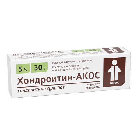 Показания лечение и профилактика остеохондроза, остеоартроза периферических суставов и позвоночника. Фармакологическое действие Стимулятор регенерации хрящевой ткани в суставах (хондропротектор). Хондроитин сульфат является высокомолекулярным мукополисахаридом, который получают из хрящей трахеи крупного рогатого скота. Влияет на обменные процессы в гиалиновом и волокнистом хрящах, уменьшает дегенеративные изменения в хрящевой ткани суставов, стимулирует биосинтез гликозаминогликанов в хондроцитах. Подавляет активность ферментов, вызывающих поражение хрящевой ткани, способствует регенерации суставной сумки и хрящевых поверхностей суставов, увеличивает продукцию внутрисуставной жидкости. Улучшает фосфорно-кальциевый обмен и снижает потерю кальция в хрящевой ткани, замедляет резорбцию костной ткани, нормализует обмен веществ в гиалиновой ткани, ускоряет процессы регенерации. Структурно близок к гепарину, препятствует образованию фибриновых тромбов в синовиальном и субхондральном микроциркуляторном русле. В результате воздействия уменьшается болезненность и увеличивается подвижность пораженных суставов. Диметилсульфоксид, входящий в состав мази, оказывает противовоспалительное, обезболивающее и фибринолитическое действие, способствует лучшему проникновению хондроитина сульфата через клеточные мембраны вглубь тканей. Мазь Хондроитин-АКОС обладает анальгезирующим и противовоспалительным действием, нормализует обмен веществ и стимулирует процессы восстановления в тканях суставов, приводит к уменьшению и исчезновению болезненности в суставах, увеличению подвижности суставов и к замедлению прогрессирования остеоартроза и остеохондроза. Лекарственное взаимодействие Не наблюдалось случаев негативного лекарственного взаимодействия при назначении мази Хондроитин-АКОС на фоне терапии другими препаратами, включенными в общепринятые схемы лечения дегенеративных заболеваний суставов и позвоночника.