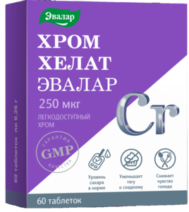 Хром – один из самых важных для организма микроэлементов, которому мало уделяют внимания. Основное его действие – совместно с инсулином усваивать сахар, улучшая тем самым метаболизм глюкозы. Согласно статистике, проблемы с уровнем сахара в крови, а также его усвоение организмом, занимают одну из лидирующих позиций. Связано это с высоким потреблением быстрых углеводов, в особенности – сладкого. Это истощает запасы хрома в организме. А дефицит хрома вызывает острое желание съесть что-нибудь сладкое. В итоге получается «замкнутый круг». Именно дополнительный прием хрома в виде пищевых добавок помогает разорвать этот круг, способствуя поддержанию в норме уровня сахара в крови.Из нормализации уровня сахара вытекает и другая важная способность хрома – контролировать массу тела. Многочисленными исследованиями было установлено, что хром способен увеличивать мышечную массу и при этом поддерживать сжигание жира. Хром помогает контролировать аппетит, легче придерживаться диеты и сбрасывать лишний вес. Дополнительный прием хрома буквально отключает желание полакомиться тортиком или любой другой сладостью.Однако, чтобы хром лучше усваивался организмом необходимо выбрать правильную форму.Для максимального усвоения хрома попробуйте легкоусвояемый хелатный комплекс Хром хелат Эвалар.Хелатная форма – это самая легкодоступная форма минералов на сегодняшний день, представляет собой соединение минерала и аминокислоты (органики и неорганики). Хелатная форма минералов наиболее близка нашему организму. Примером такой формы соединения в организме человека является гемоглобин. Хелаты не требуют дополнительных биохимических превращений, так как уже подготовлены к усвоению организмом1.Хром хелат Эвалар способствует: поддержанию нормального уровня глюкозы в крови, предотвращая «скачки» сахара, уменьшению тяги к сладкому и мучному, снижая чувство голода стабильному эмоциональному состоянию при соблюдении диеты и при похудении нормализации обмена липидов и углеводов снижению риска возникновения алиментарного ожирения и метаболического синдрома.Преимущества Хром хелат Эвалар: отличается высокой степенью усвоения, удобный прием – 1 таблетка в день, высокая дозировка хрома – 250 мкг в 1 таблетке, в составе, хром соединен с аминокислотой глицин, которая в свою очередь оказывает успокаивающее действие при соблюдении диеты и при похудении, удобная форма выпуска – таблетку можно разжевать или рассосать, что дополнительно обеспечит более быстрое усвоение, можно принимать вегетарианцам, при производстве используется высококачественное сырье из Швеции, произведено в соответствии с международным стандартом качества GMP.
