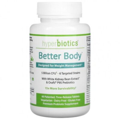 Для коррекции веса†?5 млрд КОЕ† 6 целевых штаммовС экстрактом белой фасол膆 и пребиотиками Orafti® P95В 15 раз более устойчивые микроорганизмы!Запатентованные таблетки с медленным высвобождениемВегетарианский продуктБез молочных продуктовНе содержит глютенаПищевая добавка с пробиотиками премиального качестваБлагодаря запатентованному методу высвобождения средство Better Body содержит в 15 раз более устойчивые микроорганизмы, чем в стандартных капсулах, поэтому они достигают самых отдаленных участков кишечника живыми.Это средство разработано для поддержки пищеварительной функции и обмена веществ за счет улучшения микрофлоры кишечника и переваривания углеводов.^ Средство Hyperbiotics Better Body следует принимать в сочетании со здоровым питанием и активным образом жизни.† На момент производства Минимум 1,5 миллиарда КОЕ на момент истечения срока годности.^ При регулярном приеме в рамках сбалансированного рациона и здорового образа жизни.