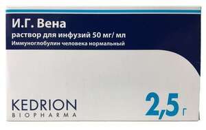 Прозрачный или слегка опалесцирующий раствор, бесцветный или светло-желтой окраски.Характеристика препарата:Препарат И.Г. Вена изготовлен из пулированной плазмы доноров с помощью фракционирования холодным этанолом с инактивацией вирусов методом сольвент-детергентной обработки и инкубацией при низком значении pH. Продукт получают из фракции белков плазмы крови человека, проверенной на отсутствие гемотрансмиссивных вирусов. Вирусная безопасность контролируется как в индивидуальной дозе, таг и в пуле плазмы. Двойная вирусинактивация и низкая антикомплементарная активность в сочетании с высокой активностью FC-фрагмента позволяют оптимизировать профиль безопасности. Распределение подклассов иммуноглобулина G (приблизительные значения):IgG1 62,1 %IgG2 34,8 %IgG3 2,5 %IgG4 0,6 %Максимальное содержание иммуноглобулина А составляет 50 мкг/мл.