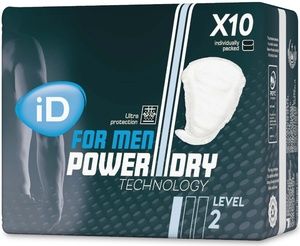 Урологические прокладки для мужчин iD for Men Level 2, упаковка 10 штук, предназначены для недержания мочи лёгкой степени. Характеристики: размер: 18×30 см, впитываемость: 470 мл, уровень впитываемости: 4 капли, производитель: Ontex (Бельгия), Особенности: легко крепятся к нижнему белью и адаптируются к телу, оставаясь незаметными под одеждой, быстро впитывают влагу, сохраняя кожу сухой и предотвращая раздражение, специальный абсорбент нейтрализует неприятные запахи, влагонепроницаемые бортики защищают от протеканий.