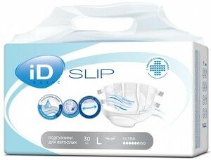 Подгузники медицинские одноразовые впитывающие для больных с недержанием, размер Large (Ultra),Обхват талии 100 — 160см. Уровень впитываемости — 5,5 капель из 8.D SLIP — Подгузники для взрослых помогают обеспечить комфорт малоподвижным людям и лежачим больным, столкнувшихся с недержанием средней и тяжёлой степени, и заметно облегчают уход за ними. Подгузники с многоуровневым впитывающим слоем iD SLIP быстро впитывают влагу и способствуют профилактике пролежней, снижая время контакта кожи промежности с биологическими жидкостями.Эластичный поясЭластичный пояс в задней части подгузника способствует более плотному и комфортному прилеганию подгузника к спине, предупреждая возможность вытекания жидкости, когда пациент лежит на спине.