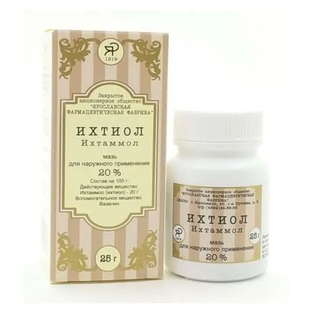 Мазь для наружного применения темно-коричневого цвета, однородной консистенции, с запахом ихтиола. Фармакологическое действие Противовоспалительное средство, оказывает противомикробное (бактерицидное в отношении Staphylococcus aureus и Streptococcus pyogenes) кератопластическое действие. Оказывает также местное раздражающее, анестезирующее и кератопластическое действие. При наружном применении ускоряет созревание фурункулов. При непосредственном действии на кожу вызывает слабое раздражение чувствительных нервных окончаний, сменяющееся снижением их чувствительности, что приводит к возникновению рефлексов, изменяющих трофику тканей. Вызывает денатурацию белковых молекул. При ректальном применении ихтаммол оказывает раздражающее действие на слизистую оболочку прямой кишки, вследствие чего рефлекторно усиливается кровообращение в органах малого таза, улучшается обмен веществ, что способствует устранению воспаления в предстательной железе у мужчин, яичниках, маточных трубах, матке у женщин. Лекарственное взаимодействие Не совместим с растворами солей йода, алкалоидами, солями тяжелых металлов, оксидом цинка.
