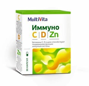 Показания к применениюMultivita Иммуно C D Zn комплексная поддержка иммунной системы. Рекомендован для людей с ослабленным иммунитетом, последствиями оксидативного стресса, признаками астении.СоставВитамин С (L-аскорбат кальция)350 мгВитамин D (холекальциферол)5 мкг (200 МЕ)Цинк (глюконат цинка)7,5 мг