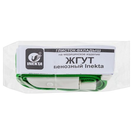 ЖГУТ ВЕНОЗНЫЙ «INEKTA» — жгут венозный взрослый. Размеры жгута «INEKTA»: Длина ленты в свободном состоянии не мене 35 см, в растянутом не более 95 см, Ширина ленты не менее 2,5 см, Длина петли в свободном состоянии не более 20 см, в растянутом не более 40 см, Допускает обработку любыми дез. средствами. Зажимное устройство жгута позволяет регулировать силу сжатия и мгновенно размыкать сжимающую петлю. Конструкция жгута позволяет работать с ним одной рукой, исключено защемление кожи, одежды. Петля жгута ослабляется или разрывается однократным нажатием на разные стороны кнопки зажимного устройства.