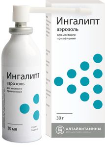 Показания к применениюОстрые и хронические воспалительные заболевания носоглотки и поражения слизистой оболочки полости рта.Применение при беременности и кормлении грудьюПротивопоказано применение препарата Ингалипт при беременности и в период грудного вскармливания. В состав препарата входят сульфаниламиды, которые проникают через плаценту и обнаруживаются в крови плода. Возможно развитие тератогенного действия. При необходимости использования препарата в период грудного вскармливания необходимо прекратить грудное вскармливание, т.к. сульфаниламиды проникают в грудное молоко и могут вызвать ядерную желтуху у новорожденных.ПротивопоказанияПовышенная чувствительность к любому из компонентов препарата, детский возраст (до 3 лет), беременность, период грудного вскармливания.Побочное действиеАллергические реакции (высыпания на коже, зуд), кратковременное ощущение жжения или першения в горле.При проявлении побочных реакций необходимо отменить применение препарата и обратиться к врачу.Если у Вас отмечаются побочные эффекты, указанные в инструкции или они усугубляются, или Вы заметили любые другие побочные эффекты, не указанные в инструкции, сообщите об этом врачу.СоставДействующие вещества:месульфамид натрия (стрептоцид растворимый)− 0,750 г,сульфатиазол натрия пентагидрат − 0,750 г,эвкалипта шарикового листьев масло − 0,015 г,мяты перечной листьев масло − 0,015 г,Тимол − 0,015 г.Вспомогательные вещества:этанол (спирт этиловый) 95 %- 1,800 г.сахароза − 1,500 г.Глицерол (глицерин) − 2,100 г.полисорбат-80 − 0,900 г.вода очищенная − до 30 мл.азот − от 0,300 до 0,400 г.Взаимодействие с другими препаратамиСовместим с другими лекарственными средствами, данные о клинически значимых взаимодействиях отсутствуют.Возможно одновременное применение с другими местными противомикробными средствами с целью расширения спектра действия и повышения эффективности.
