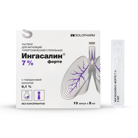 Раствор для ингаляций гипертонический стерильный Ингасалин® (далее — раствор) представляет собой прозрачный бесцветный или слегка окрашенный раствор. Раствор не содержит консервантов. Область применения и назначение Область применения — пульмонология (по назначению). Раствор предназначен для ускорения отхождения вязкого секрета (мокроты) в дыхательных путях благодаря осмотическому механизму. Свойства и эффективность Ингаляции раствора Ингасалин® ускоряют отхождение вязкого секрета (мокроты) в дыхательных путях благодаря осмотическому механизму. Высокая концентрация соли притягивает воду и способствует регидратации бронхиальной слизи. Гиапуроновая кислота (натрия гиалуронат) — компонент в составе Ингасалина®, обладает способностью связывать большое количество молекул воды и удерживать их в межфибриллярном пространстве, участвует в защитных механизмах, стимулируя движения ресничек, защищает ткань легких от пагубного воздействия ферментов Благодаря наличию гиалуроновой кислоты в составе Ингасалина® значительно улучшается переносимость и приверженность пациентов к терапии. Ингасалин® особенно показан пациентам с муковисцидозом и бронхоэктазами.