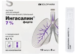 Раствор для ингаляций гипертонический стерильный Ингасалин® (далее — раствор) представляет собой прозрачный бесцветный или слегка окрашенный раствор. Раствор не содержит консервантов.Область применения и назначение:Область применения — пульмонология (по назначению).Раствор предназначен для ускорения отхождения вязкого секрета (мокроты) в дыхательных путях благодаря осмотическому механизму.Свойства и эффективностьИнгаляции раствора Ингасалин® ускоряют отхождение вязкого секрета (мокроты) в дыхательных путях благодаря осмотическому механизму. Высокая концентрация соли притягивает воду и способствует регидратации бронхиальной слизи.Гиалуроновая кислота (натрия гиалуронат) — компонент в составе Ингасалина®, обладает способностью связывать большое количество молекул воды и удерживать их в межфибриллярном пространстве, участвует в защитных механизмах, стимулируя движения ресничек, защищает ткань легких от пагубного воздействия ферментов.Благодаря наличию гиалуроновой кислоты в составе Ингасалина® значительно улучшается переносимость и приверженность пациентов к терапии.Ингасалин® особенно показан пациентам с муковисцидозом и бронхоэктазами.