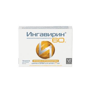 Показания к применениюЛечение гриппа А и В и других острых респираторных вирусных инфекций (аденовирусная инфекция, парагрипп, респираторно-синцитиальная инфекция, риновирусная инфекция) у детей от 7 до 17 лет.Профилактика гриппа А и В и других острых респираторных вирусных инфекций у детей от 7 до 17 лет.Применение при беременности и кормлении грудьюПрименение препарата во время беременности не изучалось. Применение препа-рата во время лактации не изучалось, поэтому при необходимости применения препарата в период лактации следует прекратить грудное вскармливание.Противопоказания Повышенная чувствительность к активному веществу или любому другому ком-поненту препарата. Дефицит лактазы, непереносимость лактозы, глюкозо-галактозная мальабсорб-ция. Беременность. Период грудного вскармливания. Детский возраст до 7 лет. Данная лекарственная форма не предназначена для применения у лиц 18 лет и старше (необходимо применение лекарственных форм, обеспечивающих возмож-ность приема препарата Ингавирин® в дозе 90 мг).Побочное действиеАллергические реакции (редко).СоставОдна капсула содержит:активное вещество: Имидазолилэтанамид пентандиовой кислоты(витаглутам) в пересчете на 100 % вещество — 60,00 мгвспомогательные вещества: лактозы моногидрат, крахмал картофельный, кремния диоксид коллоидный (аэросил), магния стеараткапсулы твердые желатиновые:титана диоксид Е 171, краситель железа оксид желтый Е 172, желатинсостав чернил для логотипа: шеллак, пропиленгликоль Е 1520, титана диоксид Е 171.Взаимодействие с другими препаратамиЛекарственное взаимодействие препарата Ингавирин не описано.
