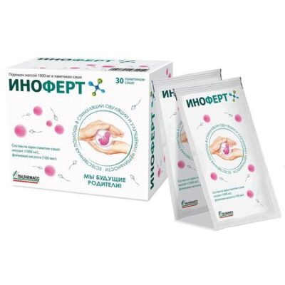 ИНОФЕРТ — естественная помощь в стимуляции овуляции и улучшении фертильности.Содержание в 1 пакетике-саше % рекомендуемого суточного потребленияИнозит ‘1000 мг 200*Фолиевая кислота 100 мкг 50*1* Не превышает верхний допустимый уровень потребления.1. Согласно ТР ТС 022/201 1.2. согласно ЕврАзЭС «Единые санитарно-эпидемиологические и гигиенические требования к товарам, подлежащим санитарно-эпидемиологическому надзору (контролю)».Область применения ИНОФЕРТ:Предупреждение: Оптимальную схему применения подбирает врач. По данным ранее проведенных исследований:• Женщинам с СПКЯ рекомендуется принимать 2-4 саше в сутки 3-6 месяцев.• Женщинам и мужчинам в составе комплексного лечения бесплодия перед ЭКО — по 4 саше в сутки, минимум 3-6 месяцев и до наступления беременности.• Сахарный диабет 2-го типа — рекомендуется принимать 4 саше в сутки 3-6 месяцев.• Гестационный диабет — рекомендуется принимать 4 саше в сутки 3-6 месяцев.По рекомендации врача, кратность и длительность приема могут быть изменены. Обычно используется доза инозита не более 4 г/сут от 3 до 6 месяцев. В высоких дозах (более 12 г/сут.) инозит иногда способен вызывать незначительные и, как правило, быстро проходящие нежелательные явления со стороны желудочно-кишечного тракта (метеоризм, диарея), тяжесть которых не нарастает с увеличением дозы даже до 30-50 г/сут Продукт следует использовать в течение срока годности, указанного на упаковке.Свойства компонентов: ИНОФЕРТ — дополнительный источник инозита и фолиевой кислоты.Инозит (Витамин В8, инозитол, мио-инозитол) — является витаминным фактором группы В.Основной функцией инозита и его производных является участие во внутриклеточной передаче сигнала и обеспечении функционирования рецепторов инсулина, репродуктивных гормонов, факторов роста, для поддержки функционирования сердечно-сосудистой системы, иммунитета и центральной нервной системы. Кроме этого, производные инозита взаимодействуют со специфическими белками, участвующими в функционировании репродуктивной системы и развитии эмбриона.В основе развития СПКЯ и как следствие — бесплодия лежит нарушение чувствительности тканей организма, в т.ч. яичников к инсулину, помочь нормализовать которую может инозит.Инозитолзависимые сигналы в клетках имеют важное значение на заключительных стадиях созревания яйцеклетки в рамках подготовки к успешной активации клетки в момент оплодотворения. Даже если у женщин с заболеваниями репродуктивной сферы беременность наступила, следует помнить, что у них повышены риски (выкидыш или преждевременные роды, гестационный диабет, гипертензия беременных), которые могут быть снижены приемом инозита. Инозит принимает участие в восстановлении регулярности менструального цикла и овуляции.При применении у мужчин ИНОФЕРТ способствует повышению объема эякулята, концентрации сперматозоидов и прогрессивной их подвижности, а также повышению эффективности вспомогательных репродуктивных технологий (ВРТ) при тяжелой патоспермии. Фолиевая кислота (витамин В9) — является водорастворимым витамином группы В, имеет гораздо большую биодоступность, чем натуральные фолаты, и быстро абсорбируется в тонком кишечнике, играет важную роль в метаболизме аминокислот, синтезе белка и нуклеиновых кислот (прежде всего в продукции ДНК и РНК) и репарации хромо