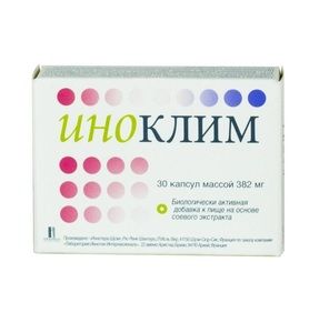 Свойства компонентовИноклим в своей основе содержит экстракт соевых бобов, богатый двумя важнейшими изофлавонами: генистеином и даидзином. Изофлавоны по структуре и молекулярной массе обладают определенным сходством с эстрогенами. Это позволяет им «узнавать» и избирательно взаимодействовать (87%) с ?-рецепторами сосудистой стенки, головного мозга, яичников, молочной железы, костной ткани, потенцируя способность воспроизводить механизмы, характерные для эстрогенов, тем самым предупреждая и уменьшая интенсивность проявлений климактерических симптомов. Оказывая эстрогенподобное действие, изофлавоны лишены побочных действий половых гормонов, которые используют при гормональной заместительной терапии в период менопаузы: не стимулируют гиперплазию слизистой половых путей и не приводят к возникновению гормонозависимых опухолей.Капсулы яйцевидной формы розового цвета, массой 382,0 гр