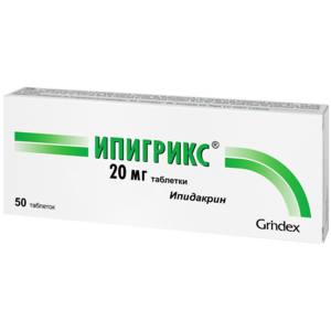 Показания к применениюИпигрикс показан при: Заболеваниях ЦНС: бульбарные параличи ипарезы, восстановительный период органических поражений ЦНС, сопровождающихся двигательными и/или когнитивными нарушениями. Заболеваниях периферической нервной системы: моно- и полинейропатия, полирадикулопатия, миастения и миастенический синдром различной этиологии. Лечении атонии кишечника.Применение при беременности и кормлении грудьюИпидакрин усиливает тонус матки и может вызвать преждевременную родовую деятельность, поэтому он противопоказан во время беременности. Применение ипидакрина в период грудного вскармливания противопоказано.ПротивопоказанияНе применять при: Эпилепсия. Гиперчувствительность к ипидакрину и/или к любому из вспомогательных веществ препарата. Стенокардия. Экстрапирамидные нарушения с гиперкинезами. Выраженная брадикардия. Бронхиальная астма. Вестибулярные нарушения. Обострение язвы желудка или двенадцатиперстной кишки. Механическая непроходимость кишечника или мочевыводящих путей. Беременность и период грудного вскармливания. Дети в возрасте до 18 лет (отсутствуют систематизированные данные о безопасности применения). С осторожностью при: язвенной болезни желудка и двенадцатиперстной кишки, тиреотоксикозе, заболеваниях сердечно-сосудистой системы, а также пациентам с обструктивными заболеваниями дыхательной системы в анамнезе или при острых заболеваниях дыхательных путей.Побочное действиеОбычно ипидакрин хорошо переносится. Побочные эффекты наблюдаются менее чем у 10 % больных и, главным образом, связаны со стимуляцией м-холинорецепторов. В дальнейшем перечисленные побочные эффекты классифицированы соответственно группам систем и органов с указанием частоты встречаемости: часто (≥1/100 до нечасто (≥1/1000 до редко (≥1/10 000 до Нарушения со стороны желудочно-кишечного тракта Часто: гиперсаливация, тошнота. Нечасто: рвота. Редко: понос, боли в эпигастрии. Неизвестно: диспепсия. Нарушения со стороны нервной системы Нечасто: головокружение, головные боли, сонливость, мышечный спазм, слабость. Нарушения сердечной функции Часто: сердцебиения, брадикардия. Нарушения со стороны органов зрения Неизвестно: миоз. Нарушения со стороны дыхательной системы, груди и средостения Нечасто: увеличение бронхиальной секреции, бронхоспазм. Нарушения со стороны скелетно-мышечной системы и соединительной ткани Неизвестно: тремор, судороги, повышение тонуса матки. Нарушения со стороны кожи и подкожных тканей Часто: потливость. Нечасто: аллергические реакции (зуд, высыпания), обычно при применении больших доз препарата.СоставОдна таблетка содержит:Активное вещество: ипидакрина гидрохлорида моногидрат — 21,6 мг (в пересчете на ипидакрина гидрохлорид — 20,0 мг);Вспомогательные вещества: лактозы моногидрат — 65,0 мг; крахмал картофельный — 12,6 мг; крахмал картофельный, высушенный — 1,4 мг; кальция стеарат — 1,0 мг.