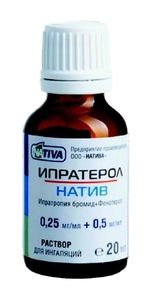 Показания к применению— профилактика и симптоматическое лечение хронических обструктивных заболеваний дыхательных путей с обратимой обструкцией дыхательных путей, таких как бронхиальная астма и, особенно, хроническая обструктивная болезнь легких, хронический обструктивный бронхит с наличием эмфиземы легких или без нее.Применение при беременности и кормлении грудьюДанные доклинических исследований и опыт применения комбинации ипратропия бромида и фенотерола показывают, что компоненты лекарственного препарата не оказывают негативного влияния при беременности. Следует учитывать возможность ингибирующего эффекта фенотерола на сократительную активность матки. Препарат противопоказан в I и III триместрах беременности (возможность ослабления родовой деятельности фенотеролом). Следует с осторожностью применять препарата во II триместре беременности. Фенотерол проникает в грудное молоко. Данных, подтверждающих, что ипратропия бромид проникает в грудное молоко, не получено. Однако препарат Ипратерол-натив следует с осторожностью назначать кормящим матерям.Противопоказания— гиперчувствительность к фенотеролу или атропиноподобным препаратам или другим компонентам препарата Ипратерол-натив — гипертрофическая обструктивная кардиомиопатия — тахиаритмия — I и III триместры беременности. С осторожностью: закрытоугольная глаукома, артериальная гипертензия, сахарный диабет, недавно перенесенный инфаркт миокарда (в течение последних 3 месяцев), заболевания сердца и сосудов, такие как хроническая сердечная недостаточность, ишемическая болезнь сердца, аортальный стеноз, выраженные поражения церебральных и периферических артерий, гипертиреоз, феохромоцитома, гиперплазия предстательной железы, обструкция шейки мочевого пузыря, муковисцидоз, II триместр беременности, грудное вскармливание, детский возраст до 6 лет.Состав1 мл ипратропия бромид моногидрат 0.261 мг, что соответствует содержанию ипратропия бромида 0.25 мг фенотерола гидробромид 0.5 мг.
