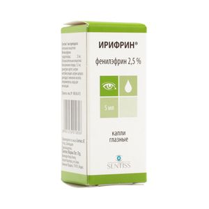 Показания к применениюДля проведения диагностических манипуляций: обеспечение мидриаза при проведении офтальмоскопии, проведение провокационных тестов при подозрении на закрытоугольную глаукому, а так же у лиц с узким профилем передней камеры глаза,предоперационная подготовка: расширение зрачка для проведения хирургических вмешательств и лазерных операций на глазном дне,проведение дифференцировки поверхностной и глубокой инъекции глазного яблока,лечение иридоциклита, синдрома «красного глаза», глаукомо-циклитических кризов, лечение спазма аккомодации и истинной миопии у лиц с высокой зрительной нагрузкой.Применение при беременности и кормлении грудьюПоскольку действие препарата Ирифрин при беременности и в период лактации изучено недостаточно, применение препарата у этих пациентов возможно только в случаях, если ожидаемая польза терапии для матери превышает потенциальный риск для плода или грудного ребенка.ПротивопоказанияИндивидуальная гиперчувствительнсоть к лекарственному средству или компонентам препарата, узкоугольная либо закрытоугольная глаукома, заболевания ССС с нарушением ритма сердца, тахикардией, повышением артериального давления, аневризмой аорты, дополнительный мидриаз при операциях с нарушением целостности тканей глазного яблока или снижением общей слезопродукции, сахарный диабет 1 типа, заболевание щитовидной железы с гиперпродукцией гормонов, недостаток глюкозо-6-фосфатдегидрогеназы, печеночная порфирия, период кормления грудью, детский возраст.Побочное действиеМестные побочные эффекты: воспаление и приходящее покраснение конъюнктивы, кератит, отек и боль в глазу, жжение, слезотечение после инстилляции, повышение внутриглазного давления. Возможно развитие реактивного сужение зрачка через сутки после инстилляции, что снижает эффективность повторных инстилляций, характерно больше для пожилых лиц.В результате значительного сокращения дилататора зрачка наблюдается появление через полчаса частичек пигмента из клеток пигментного листка радужки во влаге передней камеры глаза. И требует дифференцировки с увеитом или с проникновением форменных элементов крови.Системные побочные эффекты:Аллергические реакции проявляются в виде дерматита.Изменения ССС – увеличение ЧСС, нарушения ритма, желудочковые аритмии, повышение артериального давления, острое нарушение кровообращения в коронарных артериях, рефлекторная брадикардия, внезапная закупорка эмболом легочной артерии.Перечисленные нарушения ССС повышают риск развития инфаркта миокарда у пожилых пациентов.СоставДействующее вещество: фенилэфрина гидрохлорида. Вспомогательные вещества: натрия цитрата дигидрат, динатрия эдетат, лимонная кислота, гипромеллоза, натрия метабисульфит, вода д/инъекций. Концентрация действующего вещества (мг): 25 мг.