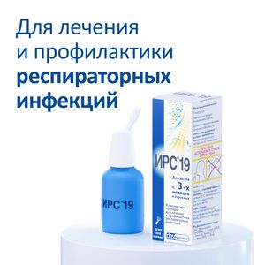 ИРС®19 — лекарственный препарат в форме спрея на основе бактериальных лизатов. ИРС®19 можно назначать как взрослым, так и детям с 3-х месячного возраста. Препарат повышает специфический и неспецифический иммунитет. При распылении ИРС®19 образуется мелкодисперсный аэрозоль, который покрывает слизистую оболочку носа, что приводит к быстрому развитию местного иммунного ответа. Специфическая защита обусловлена локально образующимися антителами класса секреторных иммуноглобулинов типа A (IgA), препятствующими фиксации и размножению возбудителей инфекции на слизистой. Неспецифическая иммунозащита проявляется в повышении фагоцитарной активности макрофагов и увеличении содержания лизоцима. ИРС®19 имеет широкий спектр показаний: профилактика хронических заболеваний верхних дыхательных путей и бронхов, лечение острых и хронических заболеваний верхних дыхательных путей и бронхов, таких как ринит, синусит, ларингит, фарингит, тонзиллит, трахеит, бронхит и др., восстановление местного иммунитета после перенесенных гриппа и других вирусных инфекций, подготовка к плановому оперативному вмешательству на ЛОР-органах и в послеоперационном периоде. Препарат не требует хранения в холодильнике*.* Инструкция по медицинскому применению лекарственного препарата ИРС®19 спрей назальный, П N012103/01