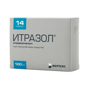 Показания к применениюдерматомикозы;грибковый кератит;онихомикозы, вызванные дерматофитами и/или дрожжами и плесневыми грибами;системные микозы: системный аспергиллез и кандидоз, криптококкоз (включая крипто-, кокковый менингит), гистоплазмоз, споротрихоз, паракокцидиоидомикоз, бластомикоз и другие системные или тропические микозы;кандидомикозы с поражением кожи или слизистых, в том числе вульвовагинальный кандидоз;отрубевидный лишай.Применение при беременности и кормлении грудьюПрепарат противопоказан к применению при беременности и в период лактации (грудного вскармливания).Женщинам детородного возраста, принимающим Итразол, необходимо использовать адекватные методы контрацепции на протяжении всего курса лечения вплоть до наступления первой менструации после его завершения.Противопоказанияиндивидуальная повышенная чувствительность к препарату или его составным частям;одновременный прием препаратов, метаболизируется с участием фермента CYP3A4: терфенадин, астемизол, мизоластин, цизаприд, дофетилид, хинидин, пимозид, ингибиторы редуктазы ГМК — КоА, такие как симвастатин и ловастатин, триазолам и мидазолам (см. также раздел «Взаимодействие с другими лекарственными средствами»);детский возраст до 3-х лет;беременность;период лактации.Побочное действиеСо стороны желудочно-кишечного тракта: диспепсия, тошнота, боль в животе и запор, обратимое повышение активности печеночных ферментов, холестатическая желтуха, гепатит, анорексия. В очень редких случаях при применении Итразола развивалось тяжелое токсическое поражение печени, в том числе случай острой печеночной недостаточности с летальном исходом; Co стороны центральной нервной системы: головная боль, утомляемость, головокружение, периферическая нейропатия; Со стороны сердечно-сосудистой системы: застойная сердечная недостаточность и отек легких; Со стороны других органов и систем: нарушение менструального цикла, аллергические реакции (такие как зуд, сыпь, крапивница и ангионевротический отек), синдром Стивенса-Джонсона, алопеция, гипокалиемия, отеки, окрашивание мочи в темный цвет, гилеркреатининемия.СоставДействующее вещество: ИтраконазолКонцентрация действующего вещества (мг): 100 мг