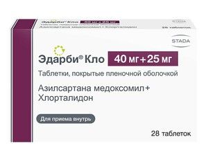 Таблетки Эдарби кло в пленочной оболочке — комбинированный антигипертензивный препарат. В состав препарата Эдарби Кло входят антагонист рецепторов ангиотензина II (азилсартана медоксомил) и тиазидоподобный диуретик (хлорталидон). Одновременное применение двух действующих веществ приводит к более выраженному снижению АД по сравнению с приемом каждого из них в монотерапии. При приеме препарата 1 раз/сут достигается эффективное снижение АД в течение 24 ч.Азилсартана медоксомил — специфический антагонист рецепторов ангиотензина II типа 1 (АТ1). Ангиотензин II образуется из ангиотензина I в реакции, катализируемой ангиотензинпревращающим ферментом (АПФ, кининаза II). Ангиотензин II является основным сосудосуживающим фактором РААС, его действие включает в себя сужение сосудов, стимуляцию синтеза и секреции альдостерона, увеличение ЧСС и реабсорбцию натрия почками.Азилсартана медоксомил является пролекарством для приема внутрь. Быстро превращается в активную молекулу азилсартана, которая избирательно препятствует развитию эффектов ангиотензина II путем блокирования его связывания с рецептором АТ1 в различных тканях, например, в гладких мышцах сосудов и надпочечниках. Поэтому его действие не связано с путем биосинтеза ангиотензина II. Рецептор AT2 также находится во многих тканях, но он не участвует в регуляции деятельности сердечно-сосудистой системы. Аффинность азилсартана к рецептору AT1 в 10 000 раз выше, чем к рецептору AT2.Угнетение активности РААС посредством ингибиторов АПФ, подавляющих образование ангиотензина II из ангиотензина I, широко применяется при лечении артериальной гипертензии. Ингибиторы АПФ подавляют также распад брадикинина, который катализируется АПФ. Поскольку азилсартан не подавляет АПФ (кининазу II), он не должен влиять на активность брадикинина. Азилсартан не связывается с другими рецепторами или ионными каналами, играющими важную роль в регуляции сердечно-сосудистой системы, и не блокирует их.Азилсартан дозозависимо подавляет сосудосуживающие эффекты инфузии ангиотензина II. Однократный прием азилсартана в дозе, эквивалентной 32 мг азилсартана медоксомила, подавлял максимальное сосудосуживающее действие ангиотензина II примерно на 90% в момент наибольшей концентрации, и примерно на 60% через 24 ч после приема. У здоровых добровольцев концентрации ангиотензина I и ангиотензина II и активность ренина в плазме крови возрастали, а концентрация альдостерона снижалась после однократного приема внутрь и после повторных доз азилсартана медоксомила, клинически значимого влияния на содержание калия или натрия в сыворотке крови не обнаружено. В целом фармакодинамические свойства азилсартана медоксомила согласуются с блокированием рецепторов AT1.Антигипертензивный эффект азилсартана медоксомила развивается в течение первых 2 недель применения с достижением максимального терапевтического эффекта через 4 недели. Снижение АД после приема внутрь однократной дозы обычно достигается в течение нескольких часов и сохраняется в течение 24 ч.Хлорталидон — тиазидоподобный диуретик, подавляет активную реабсорбцию ионов натрия в почечных канальцах (начальная часть дистального извитого канальца нефрона), увеличивая выведение ионов натрия и хлора и усиливая диурез. Кроме того, хлорталидон увеличивает выведение и
