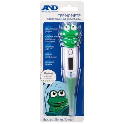 Отличительными функциональными особенностями термометра DT-624 являются: Съёмная насадка-держатель в виде Лягушки — позволяет отвлечь ребёнка в момент измерения температуры, легко надевается на палец взрослого человека Гибкий наконечник – для более комфортного измерения, принимает форму того места на теле, где проводится измерение Среднее время измерения — 60 секунд (время измерения температуры тела индивидуально для каждого человека и зависит от теплопроводности кожи) Не содержит ртути Звуковой сигнал — информирует о включении/выключении термометра, а также об окончании процесса измерений Влагозащита датчика — позволяет погружать термометр в жидкость до экрана и измерять температуру детского питания или воды для купания В комплекте с футляром для хранения Автоматическое отключение Гарантия 1 год