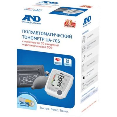 Полуавтоматический тонометр UA-705 разработан компанией ЭЙ энд ДИ. Компания ЭЙ энд ДИ – №1 производитель медицинской техники в России по данным АО «Группа ДСМ» по количеству (в шт.) в аптеках России за период 2019-2021 гг. Продукция ЭЙ энд ДИ – это высокое качество и точный выбор! Выбирайте точность! Отличительными функциональными особенностями тонометра UA-705 являются: • Большой трёхстрочный дисплей • Индикатор аритмии — сообщит о возможных нарушениях нормальной частоты или периодичности сердечных сокращений во время измерения • Память на 30 измерений, расчёт среднего давления • Диагностика давления по цветной шкале ВОЗ (Всемирной организации здравоохранения) • Гарантия на основной блок в корпусе — 10 лет