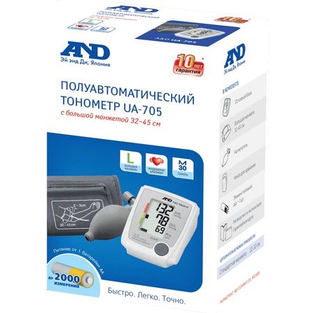 Полуавтоматический тонометр UA-705 разработан компанией ЭЙ энд ДИ. Компания ЭЙ энд ДИ – №1 производитель медицинской техники в России по данным АО «Группа ДСМ» по количеству (в шт.) в аптеках России за период 2019-2021 гг. Продукция ЭЙ энд ДИ – это высокое качество и точный выбор! Выбирайте точность! Отличительными функциональными особенностями тонометра UA-705 являются: • Большой трёхстрочный дисплей • Индикатор аритмии — сообщит о возможных нарушениях нормальной частоты или периодичности сердечных сокращений во время измерения • Память на 30 измерений, расчёт среднего давления • Диагностика давления по цветной шкале ВОЗ (Всемирной организации здравоохранения) • Гарантия на основной блок в корпусе — 10 лет