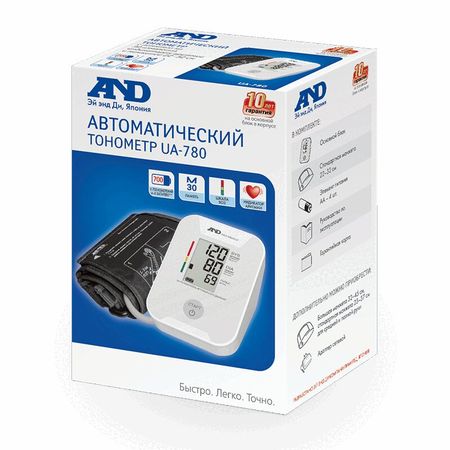 Автоматический тонометр UА-780 разработан компанией ЭЙ энд ДИ. Компания ЭЙ энд ДИ – №1 производитель медицинской техники в России по данным АО «Группа ДСМ» по количеству (в шт.) в аптеках России за период 2019-2021 гг. Продукция ЭЙ энд ДИ – это высокое качество и точный выбор! Выбирайте точность! Отличительными функциональными особенностями тонометра UA-780 являются: • Точность подтверждена по протоколу Европейского общества по гипертонии под международным названием модели UA-651 • Память на 30 измерений, расчёт среднего давления • Индикатор аритмии — сообщит о возможных нарушениях нормальной частоты или периодичности сердечных сокращений во время измерения • Диагностика давления по цветной шкале ВОЗ (Всемирной организации здравоохранения) • Гарантия на основной блок в корпусе — 10 лет