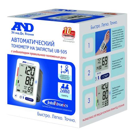 Автоматический тонометр UB-505 разработан компанией ЭЙ энд ДИ. Компания ЭЙ энд ДИ – №1 производитель медицинской техники в России по данным АО «Группа ДСМ» по количеству (в шт.) в аптеках России за период 2019-2021 гг. Продукция ЭЙ энд ДИ – это высокое качество и точный выбор! Выбирайте точность! Отличительными функциональными особенностями тонометра UB-505 являются: • Точность подтверждена по протоколу Европейского общества по гипертонии под международным названием модели UB-543 • Система интеллектуального управления Intellitronics для более комфортного и точного измерения • Индикатор правильного положения руки — во время измерения подскажет, находится ли манжета на одном уровне с сердцем, это необходимо для более точного измерения • Крупный дисплей • Два блока памяти на 60 измерений для двух пользователей, расчёт среднего давления • Календарь и часы — позволяют понять, когда было сделано измерение, просматривая память тонометра • Индикатор аритмии — сообщит о возможных нарушениях нормальной частоты или периодичности сердечных сокращений во время измерения • Диагностика давления по цветной шкале ВОЗ (Всемирной организации здравоохранения) • Гарантия на основной блок в корпусе — 10 лет