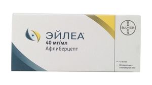 Показания к применениювзрослым пациентам для лечения: неоваскулярной (влажной) возрастной макулярной дегенерации (влажной ВМД); снижения остроты зрения, вызванного макулярным отеком вследствие окклюзии вен сетчатки (центральной вены (ОЦВС) или ее ветвей (ОВВС)); снижения остроты зрения, вызванного диабетическим макулярным отеком (ДМО).Применение при беременности и кормлении грудьюЖенщины репродуктивного возраста Женщины репродуктивного возраста должны использовать эффективные средства контрацепции в период лечения и, по крайней мере, в течение 3 месяцев после последней интравитреальной инъекции афлиберцепта (см. раздел Особые указания). Беременность Данные по применению афлиберцепта у беременных женщин отсутствуют. В исследованиях на животных была продемонстрирована эмбрио-фетотоксичность (см. раздел Особые указания). Несмотря на то, что системная экспозиция после внутриглазного введения препарата Эйлеаочень мала, препарат не следует применять при беременности, за исключением случаев, когда потенциальная польза для матери превышает потенциальный риск для плода. Период грудного вскармливания Неизвестно, проникает ли афлиберцепт в грудное молоко. Риск для ребенка при грудном вскармливании не может быть исключен. Препарат Эйлеа не рекомендуется применять при грудном вскармливании (см. раздел Особые указания). Необходимо принять решение о прерывании грудного вскармливания или воздержаться от терапии препаратом Эйлеа, принимая во внимание пользу грудного вскармливания для ребенка и пользу лечения для матери. Фертильность Результаты исследований на животных с высокой системной экспозицией препарата показывают, что афлиберцепт может нарушать фертильность особей мужского и женского пола. Такие эффекты маловероятны после внутриглазного введения препарата с учетом очень низкой системной экспозиции.Противопоказанияповышенная чувствительность к афлиберцепту или любому другому компоненту, входящему в состав препарата; активная или подозреваемая интра- или периокулярная инфекция; активное тяжелое внутриглазное воспаление; беременность и период грудного вскармливания, за исключением случаев, когда потенциальная польза для матери превышает потенциальный риск для плода (см. раздел Применение при беременности и в период грудного вскармливания), возраст до 18 лет.Составактивное вещество:афлиберцепт 40 мгвспомогательные вещества:натрия дигидрофосфата моногидрат — 1,104 мг;натрия гидрофосфата гептагидрат — 0,537 мг;натрия хлорид — 2,338 мг;сахароза — 50 мг;полисорбат 20 — 0,3 мг,вода для инъекций — до 1 мл1 фл. содержит 100 мкл раствора, что эквивалентно 4 мг афлиберцепта