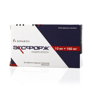 Показания к применению- артериальная гипертензия (для пациентов, которым показана комбинированная терапия).Применение при беременности и кормлении грудьюЭксфорж, как и любой другой препарат, оказывающий непосредственное влияние на РААС, не следует назначать при беременности и женщинам, желающим забеременеть. Если беременность выявлена в период лечения Эксфоржем, препарат следует отменить как можно скорее.Пациентки детородного возраста должны быть проинформированы о возможном риске для плода, связанном с применением препаратов, влияющих на РААС.Учитывая механизм действия антагонистов рецепторов ангиотензина II, нельзя исключить риск для плода. Известно, что назначение ингибиторов АПФ, оказывающих влияние на РААС, беременным во II и III триместрах, приводит к повреждению или гибели развивающегося плода. По данным ретроспективного анализа применения ингибиторов АПФ в I триместре беременности сопровождалось развитием патологии плода и новорожденного. При непреднамеренном приеме валсартана у беременных описаны случаи развития спонтанных абортов, маловодие и нарушения функции почек у новорожденных.Неизвестно, выделяются ли валсартан и/или амлодипин с грудным молоком. Поскольку в экспериментальных исследованиях отмечено выделение валсартана с грудным молоком, применять Эксфорж в период лактации (грудного вскармливания) не рекомендуется.Противопоказания- беременность;- повышенная чувствительность к компонентам препарата.Безопасность применения Эксфоржа у больных с односторонним или двусторонним стенозом почечных артерий или стенозом артерии единственной почки, у пациентов после недавно перенесенной трансплантации почки, а также детей и подростков до 18 лет не установлена.С осторожностью назначают препарат при: нарушениях функции печени (особенно при обструктивных заболеваниях желчных путей); тяжелых нарушениях функции почек (ККменьше10 мл/мин); пациентам с митральным или аортальным стенозом, гипертрофической обструктивной кардиомиопатией; при гиперкалиемии, дефиците в организме натрия и/или уменьшении ОЦК.Составамлодипина безилат 13.87 мг что соответствует содержанию амлодипина 10 мгвалсартан 160 мгВспомогательные вещества: целлюлоза микрокристаллическая — 108.13 мг, кросповидон — 40 мг, магния стеарат — 9 мг, кремния диоксид коллоидный — 3 мг.Состав пленочной оболочки: premix белая (гипромеллоза, титана диоксид, полиэтиленгликоль 4000, тальк) — 11.93 мг, premix желтая (гипромеллоза, железа оксид желтый, полиэтиленгликоль 4000, тальк) — 1.04 мг, premix красная (гипромеллоза, железа окссид красный, полиэтиленгликоль, тальк) — 0.03 мг, вода очищенная — q.s.
