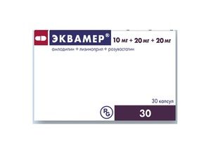 Капсулы Эквамер 10мг+20мг+20мг — комбинированный антигипертензивный и гиполипидемический препарат (блокатор «,медленных», кальциевых каналов + ингибитор ангиотензинпревращающего фермента + ингибитор ГМГ-Ко-А-редуктазы). В состав препарата Эквамер входят три действующих вещества &mdash, амлодипин, лизиноприл и розувастатин. Механизм действия препарата Эквамер основан на фармакологических свойствах действующих веществ.