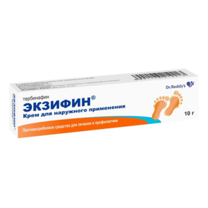 Показания к применению- профилактика и лечение грибковых инфекций кожи, в т.ч. микозов стоп (грибок стопы), паховой эпидермофитии (tinea cruris), грибковых поражений гладкой кожи тела (tinea corporis), вызванных такими дерматофитами, как Trichophyton (в т.ч. T. rubrum, T. mentagrophytes, T. verrucosum, T. violaceum), Microsporum canis и Epidermophyton floccosum;- дрожжевые инфекции кожи, в основном те, которые вызываются грибками рода Candida (например Candida albicans), в частности опрелость;- разноцветный лишай (Pityriasis versicolor), вызываемый Pityrosporum orbiculare (также известный под названием Malassezia furfur).Применение при беременности и кормлении грудьюПротивопоказаноПротивопоказанияПеченочная и/или почечная недостаточность;Алкоголизм;Опухоли;Болезни обмена веществ;Угнетение костномозгового кроветворения;Окклюзионные заболевания сосудов конечностей;Детский возраст до 12 лет (отсутствие достаточного клинического опыта).Побочное действиеСо стороны органов системы пищеварения: часто — чувство переполненного желудка, диспепсия, тошнота, потеря аппетита, боли в животе, диарея; не часто — нарушение вкусового восприятия, в т.ч. потеря вкуса, которая восстанавливается через несколько недель после прекращения лечения; редко — холестаз, желтуха, гепатит, бессимптомное увеличение уровня трансаминаз печени. Не смотря на недоказанность причинной связи этих нарушений с приемом тербинафина, в случае развития гепатобилиарной дисфункции лечение Экзифином следует прекратить.Со стороны ЦНС: редко — парестезия, гипестезия, головокружение; очень редко — депрессия, чувство повышенной тревоги.Со стороны опорно-двигательного аппарата: часто — артралгия, миалгия.Со стороны системы кроветворения: очень редко — нейтропения, агранулоцитоз, тромбоцитопения.Со стороны иммунной системы: часто — крапивница, многоформная эритема; редко — системные аллергические реакции (реакции подобные сывороточной болезни, ангиоэдема); очень редко — тяжелые кожные реакции (токсический эпидермальный некролиз, синдром Стивенса-Джонсона, фоточувствительность). При прогрессировании кожных высыпаний лечение тербинафином следует прекратить.Прочие: часто — головная боль, плохое самочувствие, чувство усталости; очень редко — экзацербация псориаза, усиленное выпадение волос.Состав1 г кремя содержит:Активное вещество: тербинафина гидрохлорид 10 мг.Вспомогательные вещества: цетиловый спирт — 40 мг, стеариловый спирт — 40 мг, цетилпальмитат — 20 мг, бензиловый спирт — 10 мг, сорбитана стеарат — 19 мг, изопропилмиристат — 80 мг, натрия гидроксид — 2 мг, полисорбат 60 — 61 мг, вода очищенная — 718 мг.