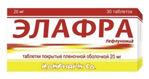 Показания к применению— активная форма ревматоидного артрита.Применение при беременности и кормлении грудьюПрепарат противопоказан при беременности и женщинам детородного возраста, которые не используют надежные противозачаточные средства.;Женщинам необходимо предохраняться от беременности в течение 2 лет после прекращения применения препарата.;Необходимо убедиться в отсутствии беременности до начала лечения. Женщинам, которые принимают лефлуномид и хотят забеременеть (или уже при наступившей беременности), рекомендуется проводить процедуру «отмывания» препарата, которая позволит быстро снизить уровень содержания активного метаболита в плазме крови (после прекращения лечения лефлуномидом назначают колестирамин в дозе 8 г 3 раза/сут в течение 11 дней или 50 г активированного угля, измельченного в порошок, 4 раза/сут в течение 11 дней). Далее необходимо определить концентрацию метаболита А771726 2 раза с интервалом 14 дней. С момента, когда концентрация препарата впервые будет зафиксирована ниже 20 мкг/л до момента оплодотворения должно пройти 1.5 мес. Следует учитывать, что без процедуры «отмывания» препарата снижение концентрации метаболита ниже 20 мкг/л происходит через 2 года. Колестирамин и активированный уголь могут влиять на абсорбцию эстрогена и прогестерона таким образом, что надежные пероральные противозачаточные средства не гарантируют необходимой контрацепции в период выведения препарата. Рекомендуется использовать альтернативные методы контрацепции.;Лефлуномид и его метаболиты проникают в грудное молоко. Поэтому применение лефлуномида в период грудного вскармливания противопоказано.Противопоказания— печеночная недостаточность; — тяжелые иммунодефицитные состояния (в т.ч. СПИД); — выраженные нарушения функции костного мозга или анемия, лейкопения, нейтропения, тромбоцитопения вследствие других причин (кроме ревматоидного артрита); — тяжелые инфекции; — умеренная или тяжелая почечная недостаточность; — тяжелая гипопротеинемия (в т.ч. при нефротическом синдроме); — беременность (необходимо исключить беременность перед началом лечения лефлуномидом); — грудное вскармливание; — детский и подростковый возраст до 18 лет; — гиперчувствительность к компонентам препарата.СоставЛефлуномид 20 мг;Вспомогательные вещества: лактозы моногидрат — 160.0 мг, гипролоза низкозамещенная — 10.0 мг, винная кислота — 6.0 мг, натрия лаурилсульфат — 1.0 мг, магния стеарат — 3.0 мг.;Состав оболочки: поливиниловый спирт — 2.7312 мг, титана диоксид — 1.9200 мг, тальк — 1.2000 мг, лецитин — 0.1200 мг, камедь ксантановая — 0.0288 мг.