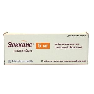 Показания к применениюПрофилактика венозной тромбоэмболии у пациентов после планового эндопротезирования тазобедренного или коленного сустава.Профилактика инсульта и системной тромбоэмболии у взрослых пациентов с неклапанной фибрилляцией предсердий, имеющих один или несколько факторов риска (таких как инсульт или транзиторная ишемическая атака в анамнезе, возраст 75 лет и старше, артериальная гипертензия, сахарный диабет, сопровождающаяся симптомами хроническая сердечная недостаточность (функциональный класс II и выше по классификации NYHA)). Исключение составляют пациенты с тяжелым и умеренно выраженным митральным стенозом или искусственными клапанами сердца.Лечение тромбоза глубоких вен (ТГВ), тромбоэмболии легочной артерии (ТЭЛА), а также профилактика рецидивов ТГВ и ТЭЛА.Применение при беременности и кормлении грудьюПрименение при беременностиДанных о применении апиксабана у беременных женщин нет. Во время доклинических исследований не обнаружено прямых или косвенных отрицательных эффектов в отношении репродуктивной функции. Применение апиксабана при беременности противопоказано.Применение в период грудного вскармливанияНет сведений о выведении апиксабана или его метаболитов с грудным молоком у человека. Согласно имеющимся данным исследований на животных апиксабан выделяется в грудное молоко. В исследованиях на крысах, концентрация препарата в грудном молоке была во много раз выше таковой в плазме крови (Сmах примерно в 8 раз выше, AUC примерно в 30 раз выше), что может свидетельствовать об активном транспорте препарата в грудное молоко. Риск для младенцев, находящихся на грудном вскармливании, не может быть исключен. При необходимости применения препарата Эликвис® следует принять решение об отмене приема препарата или прекращении грудного вскармливания.Влияние на фертильностьАпиксабан не влиял на фертильность в исследованиях на животных.СоставДействующее вещество: Апиксабан(Apixaban)Концентрация действующего вещества (мг): 5