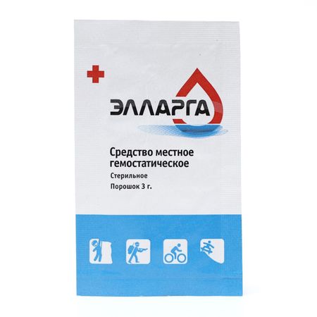 Средство местное гемостатическое, «ЭЛЛАРГА» порошок, стерильное, количество 3,0 г — МЕДИЦИНСКОЕ ИЗДЕЛИЕ По физико-химическим показателям средство соответствовует требованиям (Исполнение 1, 2) 1. Внешний вид: Порошок от светло-кремового до коричневатого цвета 2. рН водной вытяжки, не менее 4,0 3. Влажность, %, не более 10 Средство в упаковке стерильно. ОБЛАСТЬ ПРИМЕНЕНИЯ МЕДИЦИНСКОГО ИЗДЕЛИЯ Область применения — десмургия. Средство местное гемостатическое, «ЭЛЛАРГА», стерильное (далее по тексту «средство»), предназначено для остановки наружного кровотечения различной интенсивности, в том числе при повреждении крупных венозных и артериальных сосудов, преимущественно на до- госпитальном этапе. Показания к применению Средство может применяться для оказания первой медицинской и неотложной помощи при кровоточащих ранах и повреждении сосудов, а в условиях стационара для остановки кровотечения при неэффективности традиционных методов гемостаза.