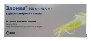 Показания к применению- контролируемая стимуляция яичников в комбинации с антагонистами ГнРГ с целью образования множественных фолликулов у женщин, участвующих в программе вспомогательной репродукции.Применение при беременности и кормлении грудьюПрименение препарата Элонва при беременности противопоказано.После контролируемой стимуляции яичников гонадотропинами в клинической практике тератогенного эффекта не выявлено. Клинические данные не позволяют исключить тератогенный эффект корифоллитропина альфа, в случае его непреднамеренного введения во время беременности. В доклинических исследованиях тератогенного эффекта, связанного с использованием лекарственного препарата не наблюдали.Применение препарата Элонв; в период лактации противопоказано.Противопоказания- опухоли яичников, молочной железы, матки, гипофиза или гипоталамуса;- кровотечения и кровянистые выделения из половых путей (не связанные с менструацией) неустановленной причины;- первичная недостаточность яичников;- кисты яичников или увеличение яичников;- синдром гиперстимуляции яичников (СГЯ) в анамнезе;- в случае, если предыдущий цикл контролируемой стимуляции яичников привел к росту более чем 30 фолликулов до размера не менее 11 мм, выявленных при ультразвуковом исследовании;- количество базальных антральных фолликулов более 20, выявленных при ультразвуковом исследовании;- фиброидные опухоли матки, при которых наступление и дальнейшее вынашивание беременности затруднено;- пороки развития репродуктивных органов, при которых беременность невозможна;- беременность;- грудное вскармливание;- повышенная чувствительность к компонентам препарата.Побочное действиеОсновными побочными реакциями в клинических исследованиях при лечении препаратом Элонва; были СГЯ (5.2%), боль и дискомфорт внизу живота (4.1% и 5.5% соответственно), головная боль (3.2%), тошнота (1.7%), утомляемость (1.4%) и жалобы со стороны молочных желез (болезненные ощущения, боль, дискомфорт, нагрубание молочных желез, увеличение груди) (1.2%).В таблице приведены основные побочные реакции (по системам органов и частоте), которые наблюдались при применении препарата в клинических исследованиях.Кроме того, описаны эктопическая беременность, невынашивание беременности и многоплодная беременность, которые рассматриваются как осложнения методов вспомогательной репродукции.Состав0.5 мл (1 шприц) содержит:Активное вещество: корифоллитропин альфа 150 мкг.Вспомогательные вещества: натрия цитрата дигидрат — 3.68 мг, сахароза — 35 мг, L-метионин — 250 мкг, полисорбат 20 — 100 мкг, хлористоводородная кислота 0.1М или натрия гидроксид 0.1М — до pH 7.0, вода д/и (извлекаемый объем) — до 0.5 мл.Взаимодействие с другими препаратамиВзаимодействие с другими препаратами не изучалось.Корифоллитропин альфа не является субстратом для изоферментов цитохрома Р450, поэтому не ожидается взаимодействия с другими препаратами.