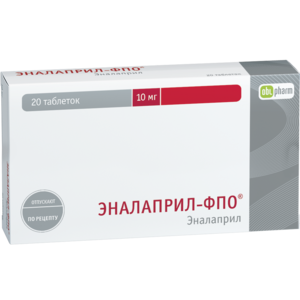 Показания к применениюАртериальная гипертензия (в т.ч. реноваскулярная), хроническая сердечная недостаточность (в составе комбинированной терапии).Эссенциальная гипертензия.Хроническая сердечная недостаточность (в составе комбинированной терапии).Профилактика развития клинически выраженной сердечной недостаточности у пациентов с бессимптомной дисфункцией левого желудочка (в составе комбинированной терапии).Профилактика коронарной ишемии у пациентов с дисфункцией левого желудочка с целью уменьшения частоты развития инфаркта миокарда и снижения частоты госпитализаций по поводу нестабильной стенокардии.Применение при беременности и кормлении грудьюАнгионевротический отек в анамнезе, двусторонний стеноз почечных артерий или стеноз почечной артерии единственной почки, гиперкалиемия, порфирия, одновременное применение с алискиреном у пациентов с сахарным диабетом или нарушением функции почек (КК меньше60 мл/мин), беременность, период лактации (грудного вскармливания), детский и подростковый возраст до 18 лет, повышенная чувствительность к эналаприлу и другим ингибиторам АПФ.Побочное действиеСо стороны ЦНС и периферической нервной системы: головокружение, головная боль, чувство усталости, повышенная утомляемость; очень редко при применении в высоких дозах — расстройства сна, нервозность, депрессия, нарушение равновесия, парестезии, шум в ушах.Со стороны сердечно-сосудистой системы: ортостатическая гипотензия, обморок, сердцебиение, боли в области сердца; очень редко при применении в высоких дозах — приливы.Со стороны пищеварительной системы: тошнота; редко — сухость во рту, боли в животе, рвота, диарея, запор, нарушение функции печени, повышение активности печеночных трансаминаз, повышение концентрации билирубина в крови, гепатит, панкреатит; очень редко при применении в высоких дозах — глоссит.Со стороны системы кроветворения: редко — нейтропения; у пациентов с аутоиммунными заболеваниями — агранулоцитоз.Со стороны мочевыделительной системы: редко — нарушения функции почек, протеинурия.Со стороны дыхательной системы: сухой кашель.Со стороны репродуктивной системы: очень редко при применении в высоких дозах — импотенция.Дерматологические реакции: очень редко при применении в высоких дозах — выпадение волос.Аллергические реакции: редко — кожная сыпь, отек Квинке.Прочие: редко — гиперкалиемия, мышечные судороги.СоставЭналаприла малеат 10 мг.Вспомогательные вещества: крахмал кукурузный, лактоза (сахар молочный), целлюлоза микрокристаллическая, кремния диоксид коллоидный (аэросил А–300), кальция стеарат.