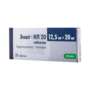 Показания к применению- артериальная гипертензия (у пациентов, которым показана комбинированная терапия).Применение при беременности и кормлении грудьюПрепарат Энап-НЛ 20 противопоказан при беременности.Воздействие ингибиторов АПФ на плод в I триместре беременности не установлено. Применение ингибиторов АПФ во II и III триместрах беременности сопровождалось отрицательным воздействием на плод и новорожденного. У новорожденных развивались артериальная гипотензия, почечная недостаточность, гиперкалиемия и/или гипоплазия костей черепа. Возможно развитие олигогидрамниона, по-видимому, вследствие нарушения функции почек плода. Это может приводить к контрактуре конечностей, деформации костей черепа, включая его лицевую часть, и гипоплазии легких.Применение диуретиков при беременности не рекомендуется, поскольку может вызвать желтуху плода и новорожденного, тромбоцитопению и, возможно, другие нежелательные реакции, наблюдавшиеся у взрослых.Эналаприл и гидрохлоротиазид проникают в грудное молоко. Поэтому при назначении препарата Энап-НЛ 20 в период лактации необходимо отказаться от грудного вскармливания.Противопоказания- анурия;- выраженные нарушения функции почек (КК<30 мл/мин);- ангионевротический отек в анамнезе, связанный с применением ранее ингибиторов АПФ;- наследственный или идиопатический ангионевротический отек;- двусторонний стеноз почечных артерий, стеноз артерии единственной почки;- непереносимость лактозы, дефицит лактазы или синдром мальабсорбции глюкозы-галактозы;- беременность;- период лактации;- детский и подростковый возраст до 18 лет (эффективность и безопасность не установлены);- повышенная чувствительность к компонентам препарата или производным сульфонамида.С осторожностью следует назначать препарат при выраженном стенозе устья аорты или идиопатическом гипертрофическом субаортальном стенозе, ИБС, цереброваскулярных заболеваниях (в т.ч. недостаточность мозгового кровообращения), хронической сердечной недостаточности, выраженном атеросклерозе, тяжелых аутоиммунных системных заболеваниях соединительной ткани (в т.ч. СКВ, склеродермия), угнетении костномозгового кроветворения, сахарном диабете, гиперкалиемии, состоянии после трансплантации почек, нарушениях функции печени, нарушениях функции почек (КК 30-75 мл/мин), состояниях, сопровождающихся снижением ОЦК (в результате терапии диуретиками, при ограничении потребления поваренной соли, диарее и рвоте), пациентам пожилого возраста.Составэналаприла малеат 20 мггидрохлоротиазид 12.5 мгВспомогательные вещества: натрия гидрокарбонат, лактозы моногидрат, крахмал кукурузный, крахмал прежелатинизированный, тальк, магния стеарат.