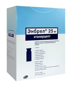Показания к применениюРевматоидный артритВ комбинации с метотрексатом Энбрел назначается взрослым при лечении активного ревматоидного артрита средней и высокой степени тяжести, когда ответ на базисные противовоспалительные препараты (БПВП), включая метотрексат, был неадекватным. Энбрел может назначаться в виде монотерапии в случае неэффективности или непереносимости метотрексата.Энбрел показан для лечения тяжелого, активного и прогрессирующего ревматоидного артрита у взрослых, не получавших ранее терапии метотрексатом.Ювенильный идиопатический полиартритЛечение активного ювенильного идиопатического полиартрита (серопозитивного и серонегативного) у детей и подростков в возрасте 2-17 лет, у которых наблюдалась недостаточная эффективность или непереносимость метотрексата.Лечение распространенного олигоартрита у детей и подростков в возрасте старше 2 лет, у которых наблюдалась недостаточная эффективность или непереносимость метотрексата. Лечение псориатического артрита у подростков в возрасте старше 12 лет, у которых наблюдалась недостаточная эффективность или непереносимость метотрексата.Лечение артрита, ассоциированного с энтезитами, у подростков в возрасте старше 12 лет, у которых наблюдалась недостаточная эффективность или непереносимость стандартной терапии.Псориатический артритЛечение активного и прогрессирующего псориатического артрита у взрослых, когда ответ на терапию БПВП был неадекватным.Аксиальная форма спондилоартритаАнкилозирующий спондилитЛечение взрослых с тяжелым активным анкилозирующим спондилитом, у которых традиционная терапия не привела к существенному улучшению.Дорентгенологическая стадия аксиальной формы спондилоартритаЭтанерцепт показан для лечения взрослых пациентов с тяжелым течением дорентгенологической стадии аксиальной формы спондилоартрита, у которых отмечался неадекватный ответ или резистентность к стандартной терапии, а также имеются объективные признаки активности заболевания, подтвержденные повышением концентрации С-реактивного белка (СРБ) и/или данными МРТ-сканирования.ПсориазЛечение взрослых с псориазом умеренной и тяжелой степенью выраженности, у которых имеются противопоказания или непереносимость другой системной терапии, включающей циклоспорин, метотрексат или PUVA-терапию.Лечение детей в возрасте 6 лет и старше с хроническим псориазом тяжелой степени выраженности, у которых наблюдалась непереносимость или недостаточный ответ на другую системную или фототерапию.Применение при беременности и кормлении грудьюБеременным женщинам не рекомендуется терапия Энбрелом, т.к. нет опыта применения этого препарата у данной категории пациентов.Женщинам детородного возраста не следует планировать беременность во время лечения Энбрелом.Неизвестно, может ли этанерцепт выделяться с грудным молоком. Поскольку иммуноглобулины, как и многие другие препараты, могут выделяться с молоком человека, следует либо прекратить грудное вскармливание, либо прекратить прием Энбрела во время грудного вскармливания.