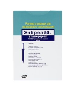 Показания к применениюЛечение умеренного или тяжелого активного ревматоидного артрита (в комбинации с метотрексатом или в качестве монотерапии).Лечение умеренного и тяжелого активного ювенильного идиопатического полиартрита у детей и подростков в возрасте 2-17 лет (при недостаточной эффективности или непереносимости метотрексата).Лечение активного и прогрессирующего псориатического артрита у взрослых (при неэффективности БПВП).Для уменьшения симптомов у пациентов с активным анкилозирующим спондилитом (при неэффективности стандартной терапии).Лечение умеренно выраженного или тяжелого псориаза у взрослых (при наличии противопоказаний или непереносимости другой системной терапии, включающей циклоспорин, метотрексат или PUVA-терапию).Лечение детей в возрасте 6 лет и старше с хроническим тяжелым псориазом (при непереносимости или недостаточной эффективности другой системной терапии или фототерапии).Применение при беременности и кормлении грудьюПротивопоказано применение при беременности и в период лактации (грудного вскармливания).ПротивопоказанияСепсис или состояния с повышенным риском его развития; тяжелые активные инфекции, включая хронические или локализованные инфекции; беременность, период лактации (грудного вскармливания); повышенная чувствительность к этанерцепту.Состав1 шприц содержит: Активное вещество: этанерцепт 0,05 мг/1 мл.Вспомогательные вещества: аргинина гидрохлорид, натрия хлорид, сахароза, натрия гидрофосфата дигидрат, натрия дигидрофосфата дигидрат, вода д/и.0.5 мл — шприцы одноразовые бесцветного стекла с иглой (1) в комплекте со спиртовыми салфетками (2 шт.) — упаковки пластиковые (4) — пачки картонные.