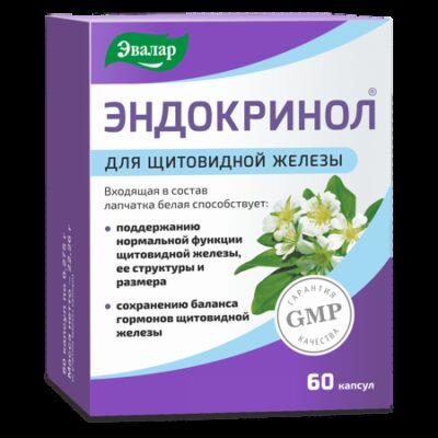 ЭНДОКРИНОЛ — Биологически активная добавка (БАД) к пище — негормональное средство для поддержания нормальной функции щитовидной железы, ее структуры и размера, сохранения баланса ее гормоновАктивное вещество:корневища и корни лапчатки белой, экстракт лапчатки белой, витамин Е.Действие:для щитовидной железы.Содержание в 2 капсулах (суточном приеме):Лапчатка белая корневища и корни 300 мгЛапчатка белая экстракт сухой 50 мгВитамин Е 10 мгСила природы для щитовидной железыСегодня для лечения щитовидной железы применяют в основном синтетические гормональные препараты. Однако стоит отметить, что все они могут иметь ряд побочных эффектов и значительно снижать качество жизни.Именно поэтому фитотерапевты постоянно изучают свойства лекарственных растений и эффективность их применения для лечения щитовидной железы.Отдельного внимания заслуживает редкий вид травы — лапчатка белая.Основные работы по ее изучению проводились в 70-80-х годах прошлого века.По результатам клинических исследований было установлено, что корень лапчатки белой — это мощный регулятор уровня гормонов щитовидной железы.В лапчатке белой содержатся важные для здоровья щитовидной железы вещества, поэтому лапчатка поддерживает ее нормальную функцию и размеры.В России это уникальное растение выращивает компания «Эвалар» на собственных плантациях в экологически чистых предгорьях Алтая.Специалисты компании тщательно следят за ростом растения, собирают строго в период максимальной насыщенности биологически активными веществами и перерабатывают по современной технологии при низкотемпературных режимах, чтобы сохранить максимум пользы растения.Специальные особенности: не содержит сахара, глютена, ГМО